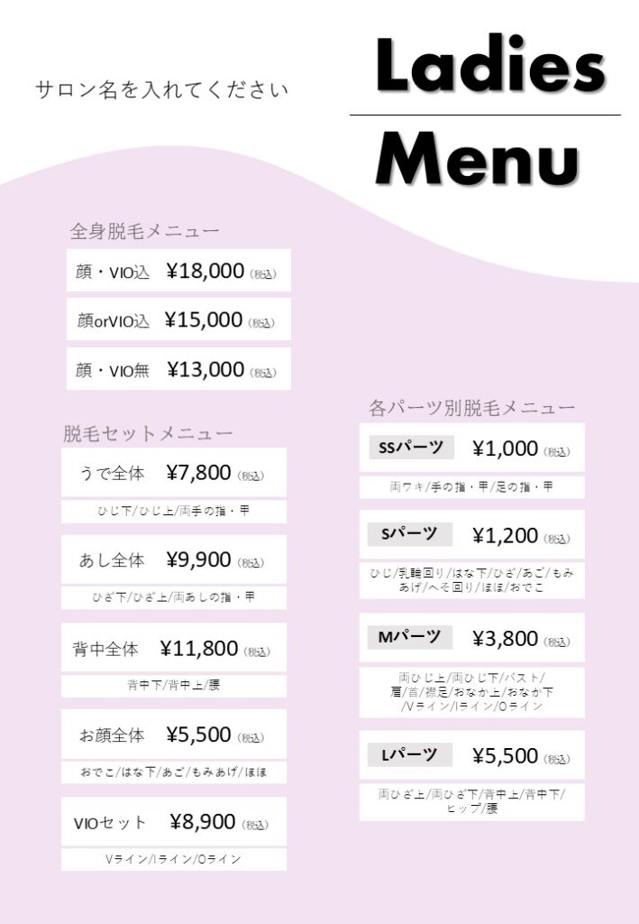 サロンでのメニュー表です。メニュー表を作る際に参考にしていただけます。 ダウンロード -