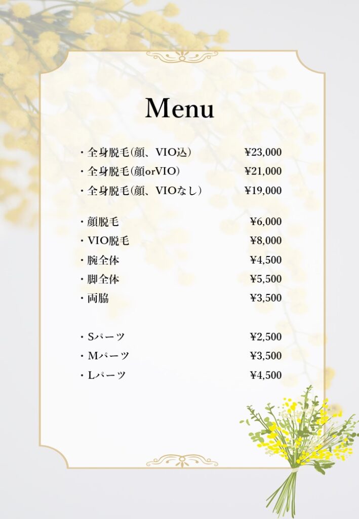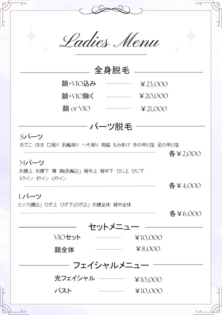 光フェイシャルのメニュー表となっております。メニュー表を作る際に編集してご利用ください。ダウンロード -