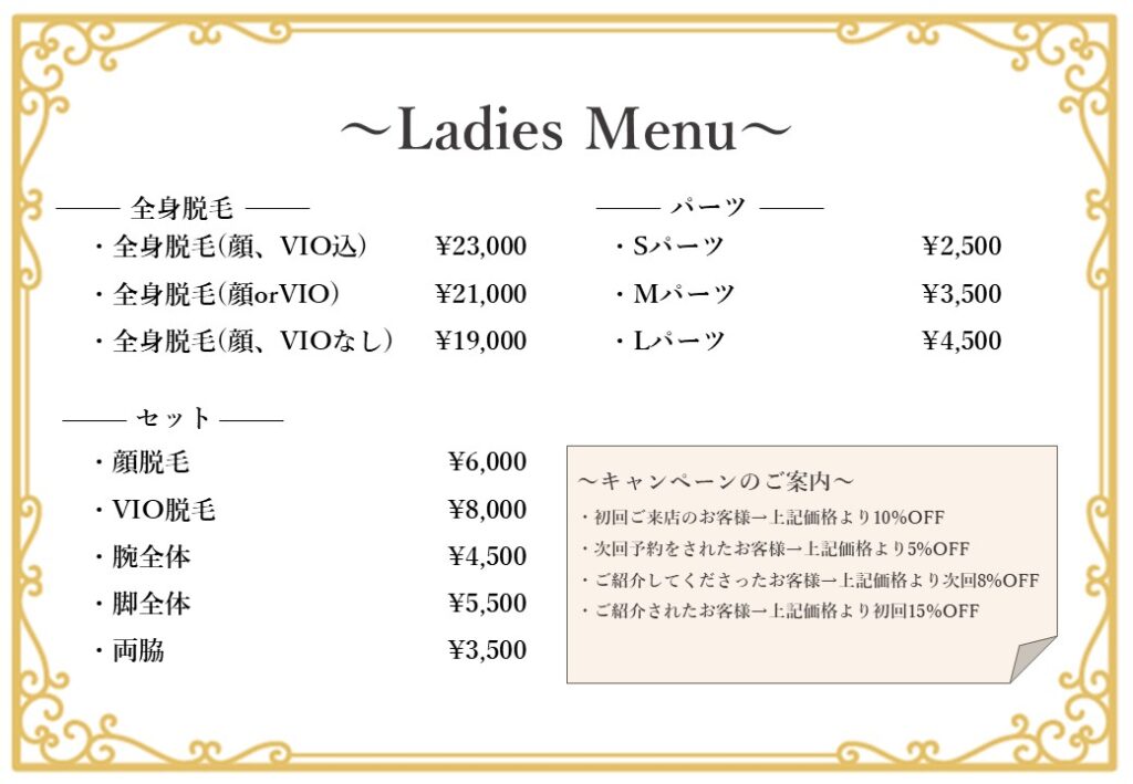 【パワーポイント】サロンでのレディースメニュー表です。パワーポイントのデータで提供しています。メニュー表を作る際に編集してご利用いただけます。ダウンロード -