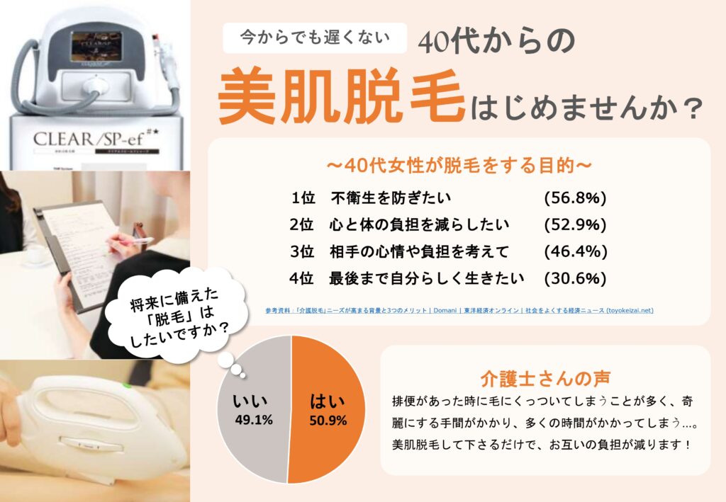 40代から将来に向けて脱毛していただけよう、同じ世代の方のリアルなお声を載せて脱毛に踏み込んでいただきやすくなるようなPOPになります。店内の装飾やご提案の際にご... -