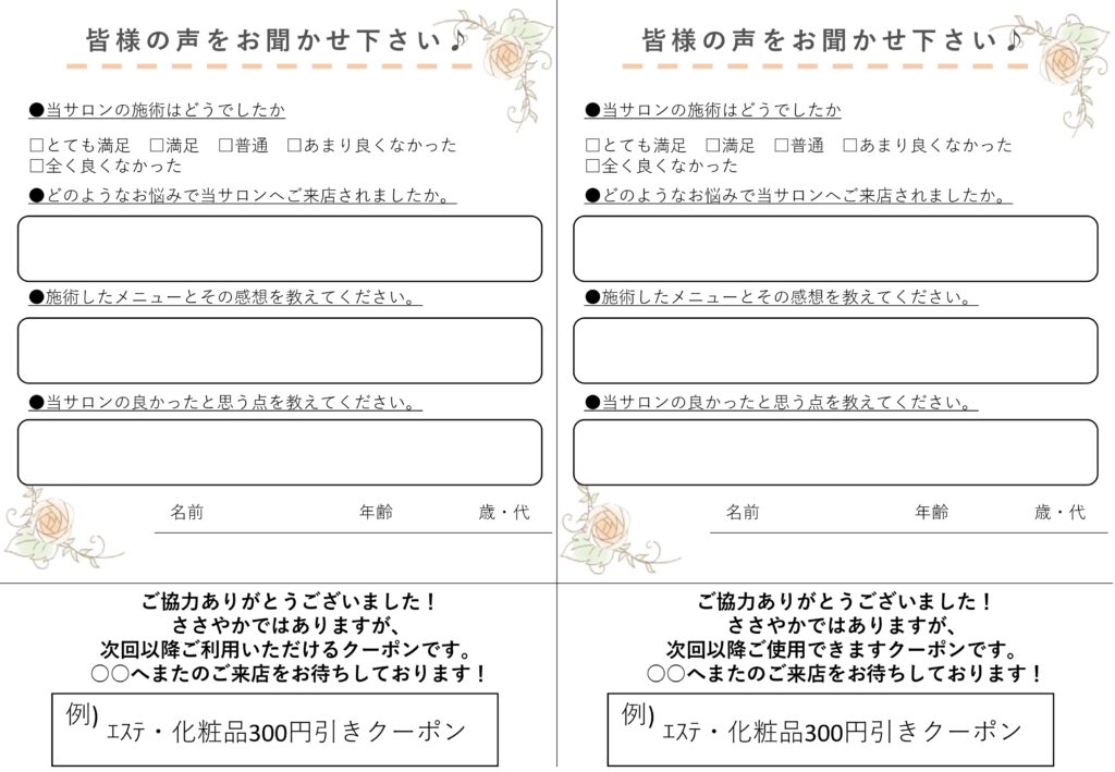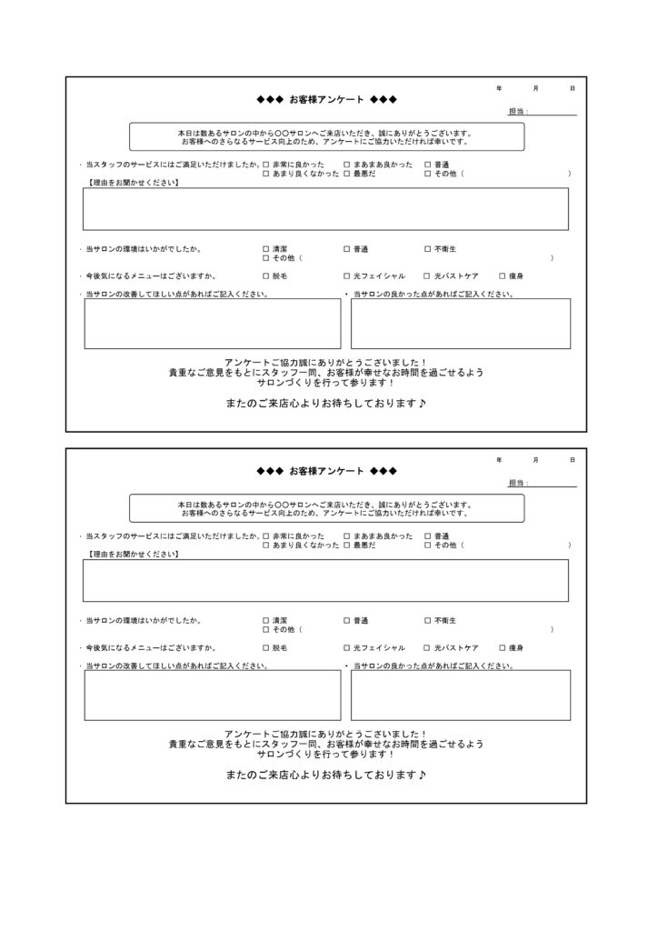 お手入れ後のお客様へご記入いただき、サロンサービス向上のためにご活用頂けます。ダウンロード -