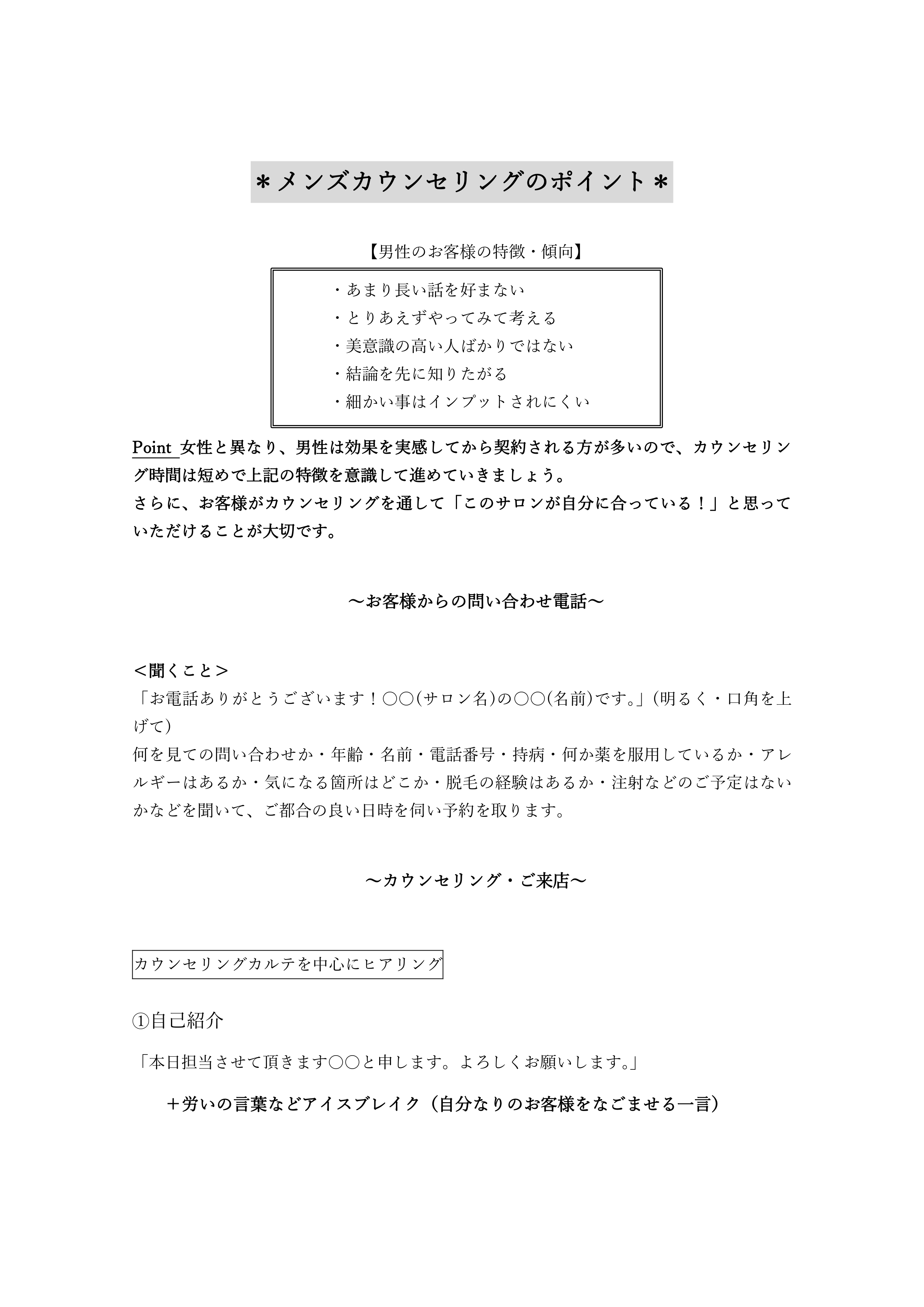 【提供資料】メンズカウンセリングポイント 2022 3/18 提供資料 その他資料 メンズ 2022年3月18日2024年3月5日 男性のお客様に対するカウンセリングのポイントです。 ダウンロード 提供資料 その他資料 メンズ 関連記事 メンズVIOお手入れ手順 2025年2月20日 お手入れ延期同意書 2022年11月14日2025年9月3日 【提供資料】スタンプ打ちお手入れ法 2022年4月22日 【提供資料】お客様同意書 2022年3月9日 【提供資料】カウンセリングカルテ(バスト用) 2022年3月9日 【提供資料】カウンセリングカルテ(女性用) 2022年3月9日 【提供資料】カウンセリングカルテ(男性用) 2022年3月9日 【提供資料】カウンセリングカルテ参考例 2022年3月9日