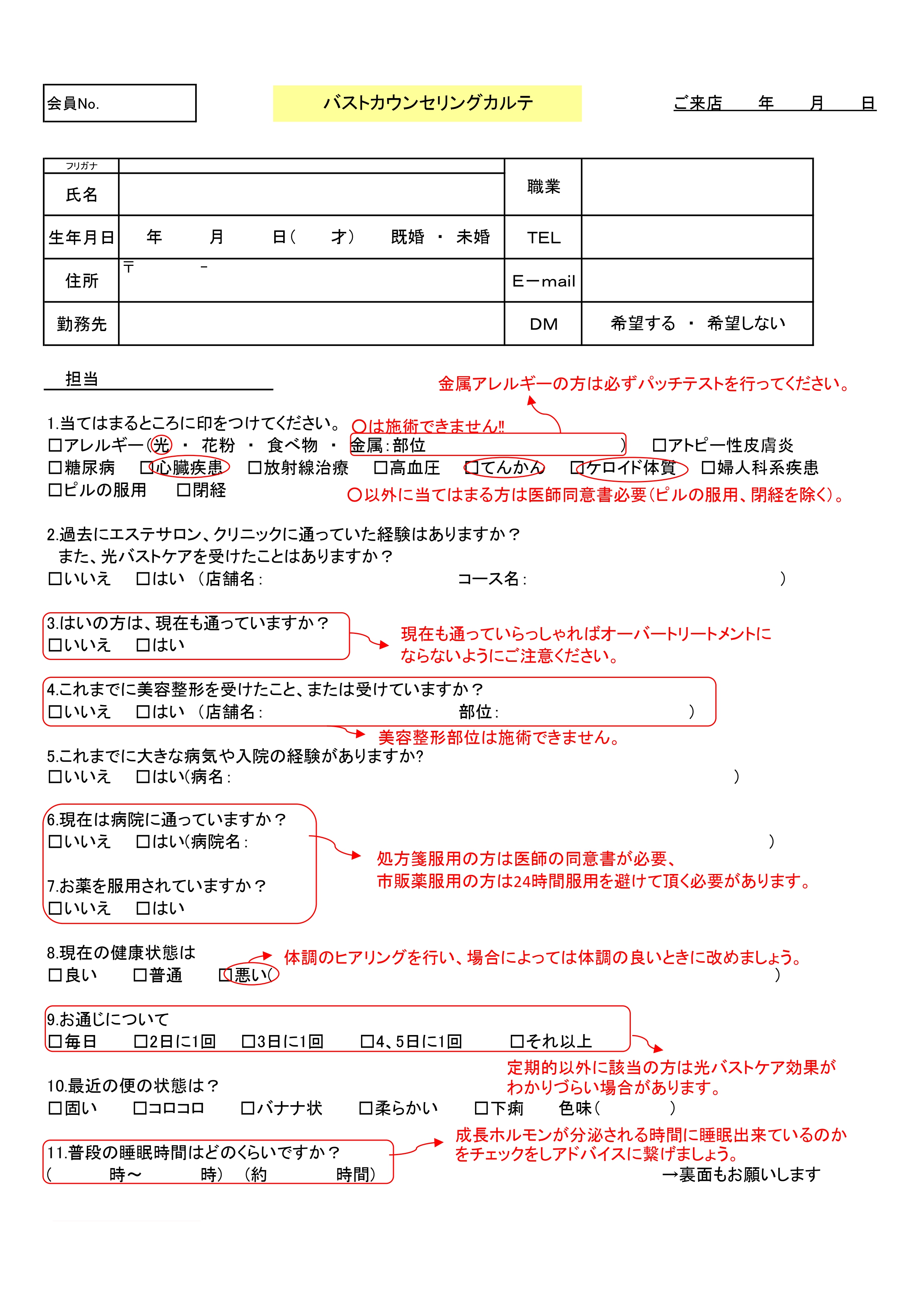 【提供資料】バストカウンセリングカルテ参考例 2022 3/09 提供資料 カルテ 2022年3月9日 バストカウセリングの際にご参考いただけるカルテです。 ダウンロード 提供資料 カルテ 関連記事 メンズVIOお手入れ手順 2025年2月20日 お手入れ延期同意書 2022年11月14日2025年9月3日 【提供資料】スタンプ打ちお手入れ法 2022年4月22日 【提供資料】メンズカウンセリングポイント 2022年3月18日2024年3月5日 【提供資料】お客様同意書 2022年3月9日 【提供資料】カウンセリングカルテ(バスト用) 2022年3月9日 【提供資料】カウンセリングカルテ(女性用) 2022年3月9日 【提供資料】カウンセリングカルテ(男性用) 2022年3月9日