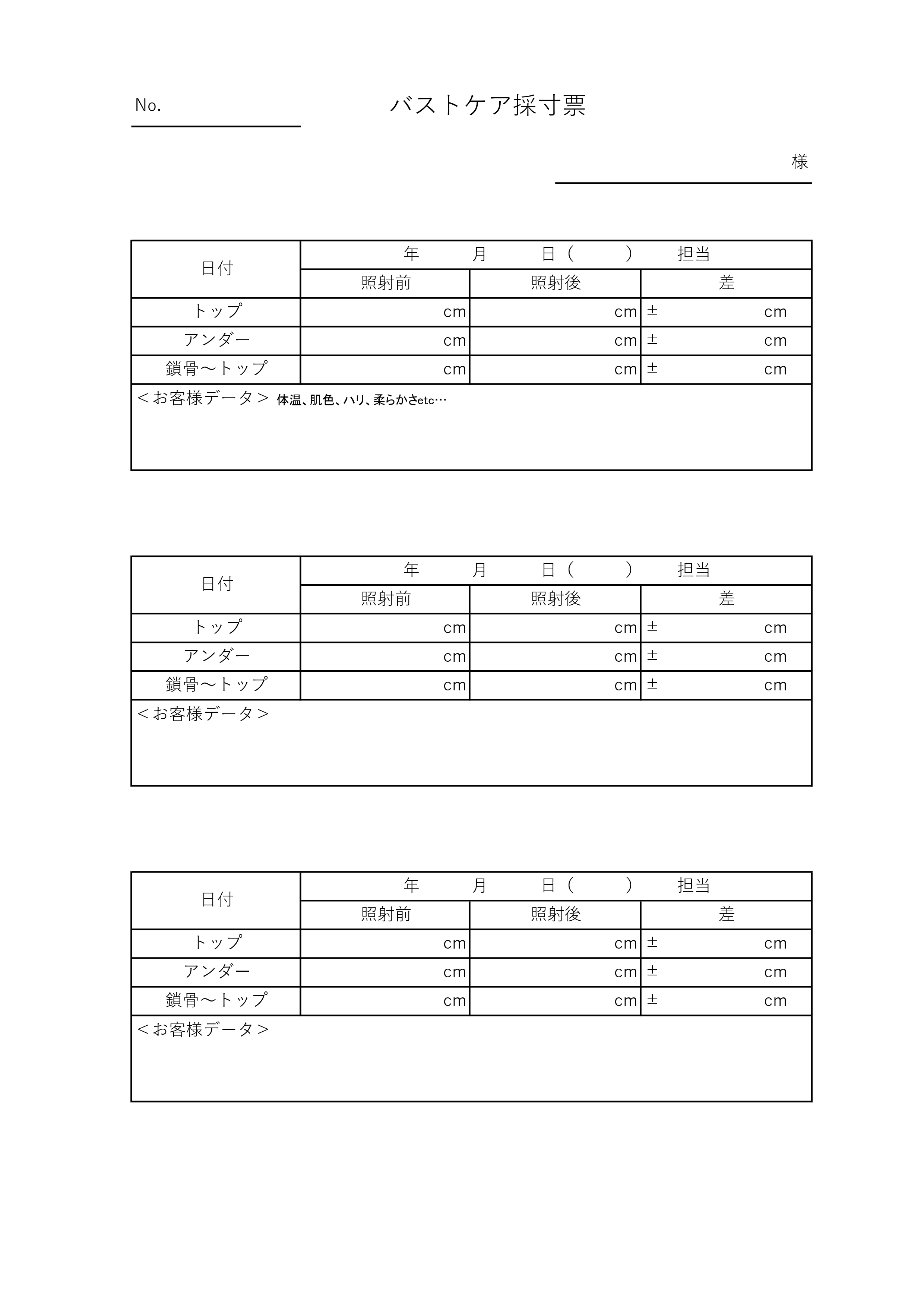 【提供資料】バストケア採寸表 2022 1/11 提供資料 その他資料 2022年1月11日 バストケアの際にご利用頂ける資料になります。 ダウンロード 提供資料 その他資料 関連記事 メンズVIOお手入れ手順 2025年2月20日 お手入れ延期同意書 2022年11月14日2025年9月3日 【提供資料】スタンプ打ちお手入れ法 2022年4月22日 【提供資料】メンズカウンセリングポイント 2022年3月18日2024年3月5日 【提供資料】お客様同意書 2022年3月9日 【提供資料】カウンセリングカルテ(バスト用) 2022年3月9日 【提供資料】カウンセリングカルテ(女性用) 2022年3月9日 【提供資料】カウンセリングカルテ(男性用) 2022年3月9日