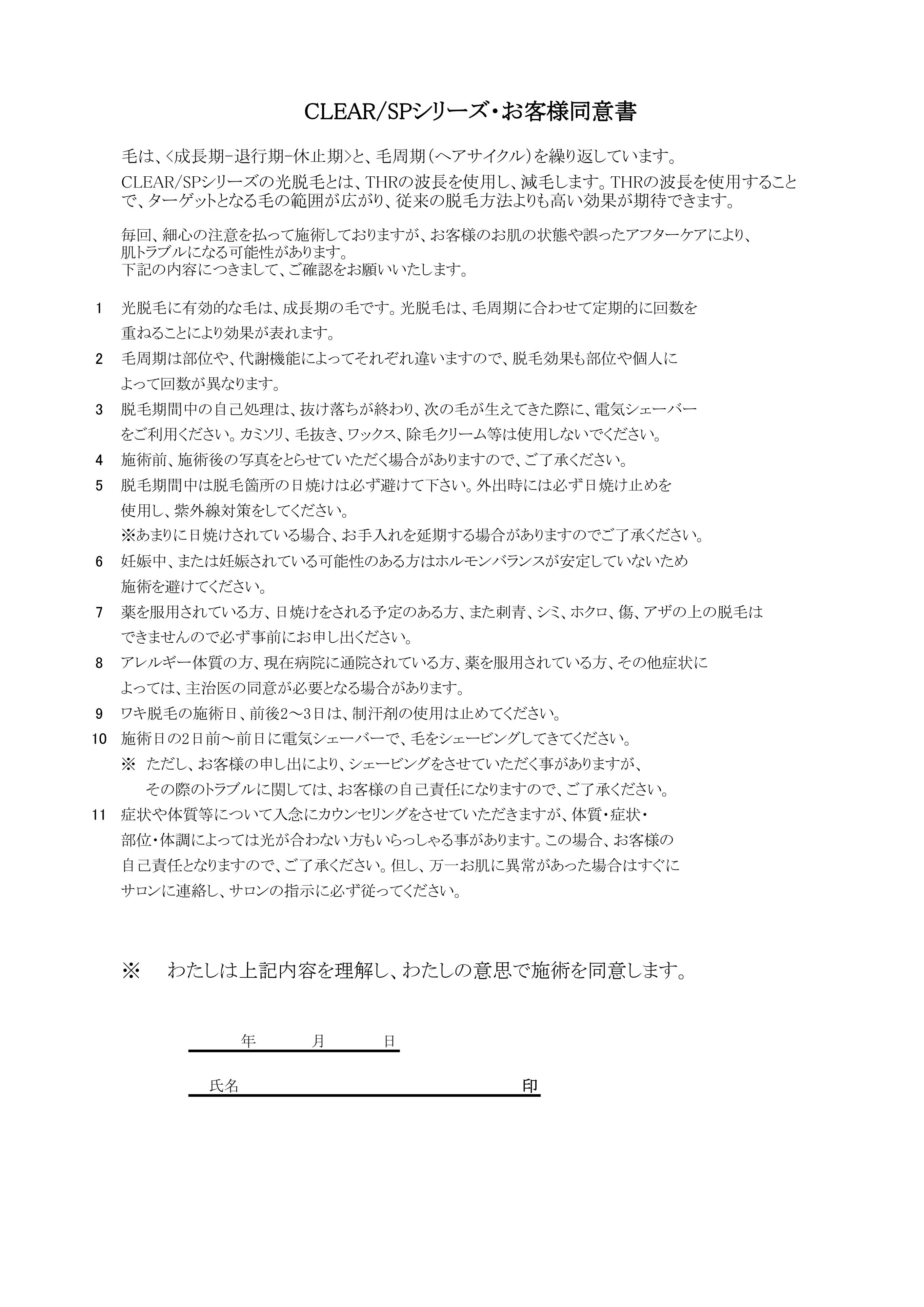 【提供資料】お客様同意書 2020 3/03 提供資料 同意書 2020年3月3日 脱毛を受けられるお客様へご案内する同意書です。 ダウンロード 提供資料 同意書 関連記事 メンズVIOお手入れ手順 2025年2月20日 お手入れ延期同意書 2022年11月14日2025年9月3日 【提供資料】スタンプ打ちお手入れ法 2022年4月22日 【提供資料】メンズカウンセリングポイント 2022年3月18日2024年3月5日 【提供資料】お客様同意書 2022年3月9日 【提供資料】カウンセリングカルテ(バスト用) 2022年3月9日 【提供資料】カウンセリングカルテ(女性用) 2022年3月9日 【提供資料】カウンセリングカルテ(男性用) 2022年3月9日