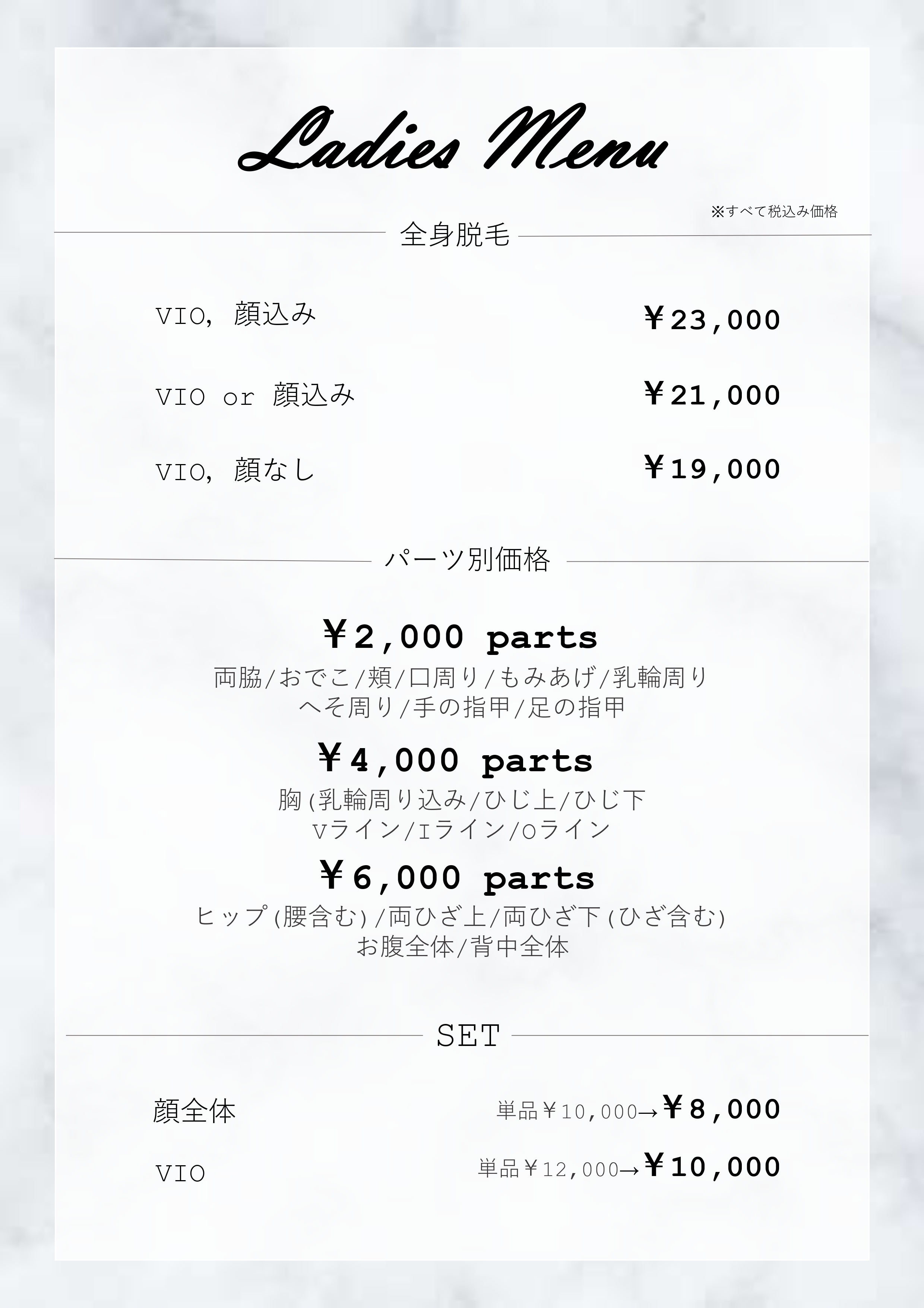 レディースメニュー表素材【編集可能】 2021 9/16 メニュー表 レディース レディースメニュー 2021年9月16日2024年3月29日 【パワーポイント】サロンでのレディースメニュー表です。パワーポイントのデータで提供しています。メニュー表を作る際に編集してご利用いただけます。 ダウンロード メニュー表 レディース レディースメニュー 関連記事 【メニューPOP】VIO光ピーリング脱毛 2025年8月13日2025年10月8日 夏の魅せ肌キャンペーンPOP【編集可能】 2025年5月17日2025年10月9日 テラサーキュラージェル×光フェイシャルメニューPOP【編集可能】 2025年4月3日2025年10月6日 プラズマ光フェイシャルメニューPOP【編集可能】 2025年2月21日 フラッシュクリームメニュー表【編集可能】 2025年2月21日 メンズメニュー表素材【編集可能】 2025年2月20日2025年2月21日 レディースメニュー表素材【編集可能】 2025年2月20日2025年2月21日 光フェイシャルメニュー表【編集可能】 2025年2月15日2025年7月25日