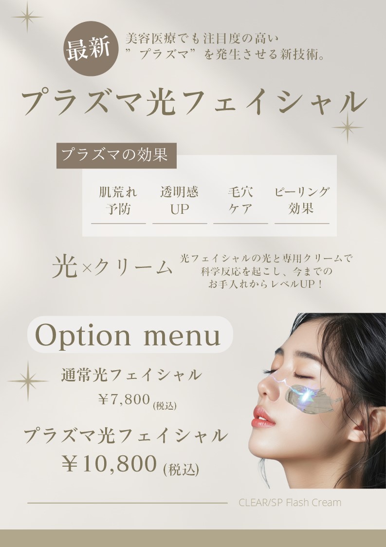 フラッシュクリームによる光フェイシャルのメニューPOPになっております。ご提案にご活用ください。
