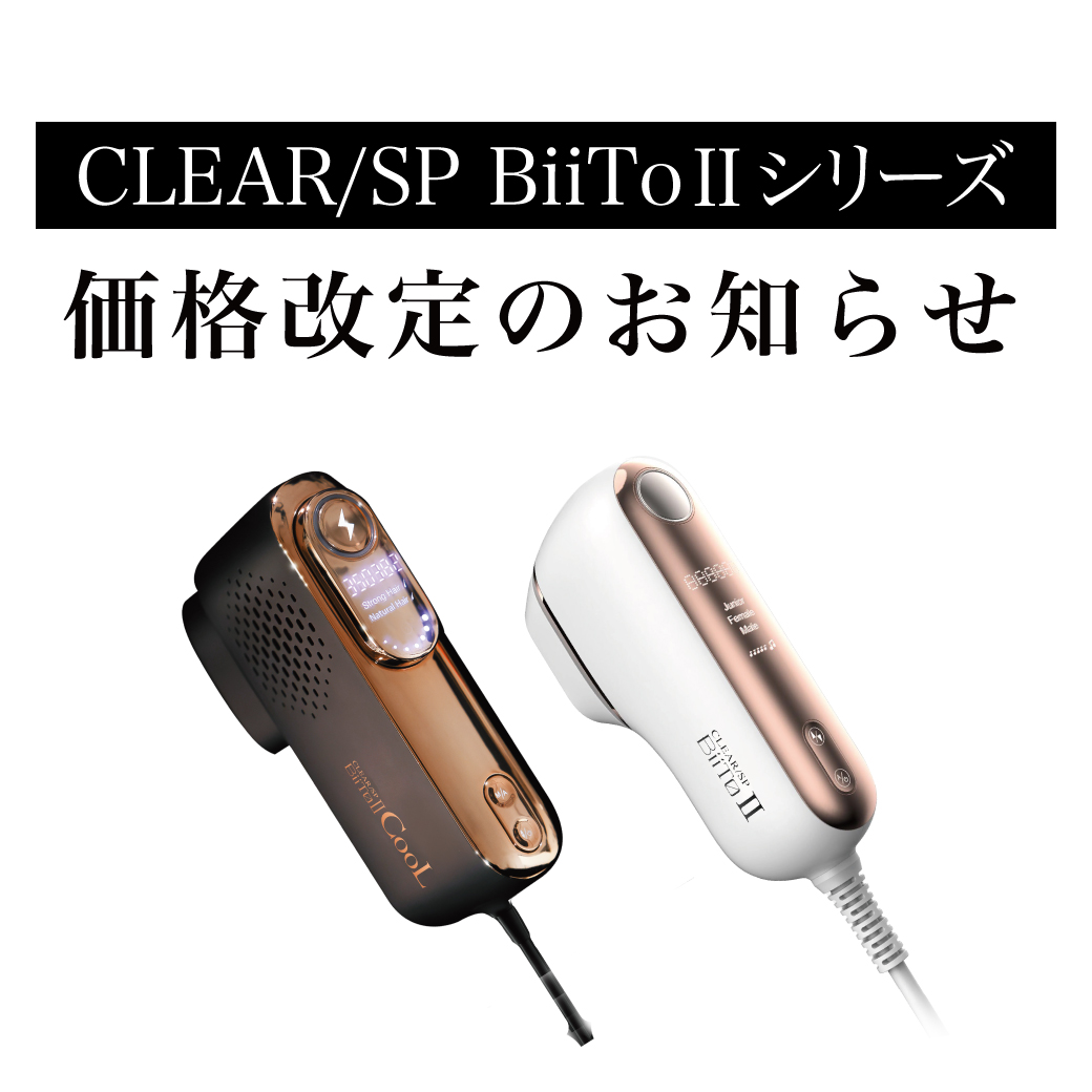 【重要】CLEAR/SP BiiToⅡシリーズ 価格改定のお知らせ 2024 11/15 NEWS 2024年11月15日2025年1月21日 【重要】CLEAR/SP BiiToⅡシリーズ 価格改定のお知らせ NEWS 関連記事 【年末年始休業のお知らせ】 2025年12月2日 【重要なお知らせ】SoftBankキャリアメール受信不具合について 2025年8月25日 【キャンペーン】VIO光ピーリング脱毛セット 2025年8月6日2025年10月23日 【夏季休業のお知らせ】 2025年7月31日2025年8月21日 【終売のご案内】CLEAR/SP BiiToⅡ デラックスセット 2025年5月19日 GW休業のお知らせ 2025年4月17日2025年6月27日 【豪華特典】BWJ東京2025出展のお知らせ 2025年4月9日2025年6月27日 「テラサーキュラージェル」が3月27日より販売開始! 2025年3月27日2025年6月27日