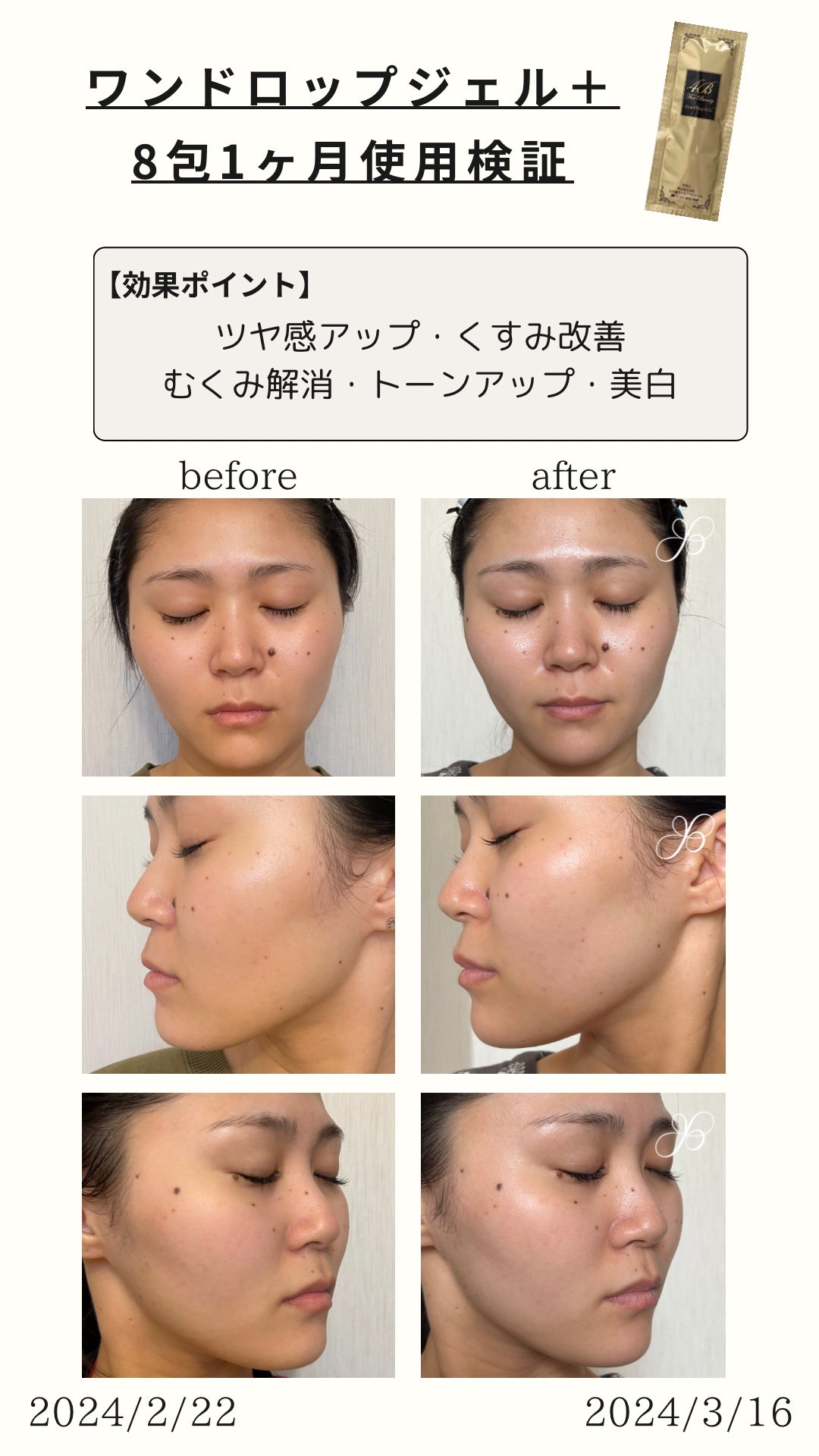提供用のPOPとなります。ワンドロップジェル+を1ヶ月で8包使用したビフォーアフター写真です。1ヶ月間の使用方法は1〜3包目は毎日、4〜5包目は3日に1回、6〜7包目は5日に1回、8包は1週間に1回となります。お客様へのワンドロップジェル+の販促ツールとしてSNSや店内POPとしてご使用いただけます。